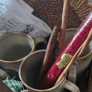 Gift yourself or a friend with this vintage woven basket featuring apple themed mugs, with a few cinnamon sticks, a fun kitchen towel, and much more.