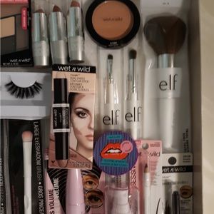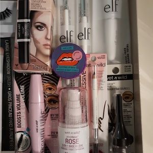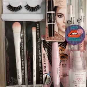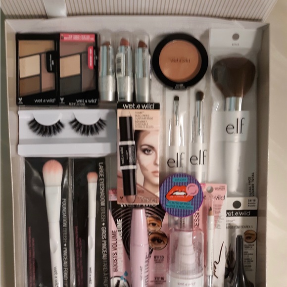 Gift set includes Ecotools powder brush and blending sponge. EcoTools daily defined eyekit with storage tin, brushes include large shadow brush, accent shadow brush, angled crease brush, detail liner, and liner smudge brush. Milani makeout last setting spray, physicians formula bronzer in light bronzer. WetnWild dewy face primer, blush in pinch me pink, liquid eyeliner in espresso, mascara invert black, lip scrub in watermelon pasteur, eyebrow kit, and four lipsticks in colors, ranging red, breeze, in the near future, and fascia with blue pearl. Gift box included.