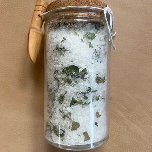 4. 16oz Sea Salt + Eucalyptus bath salts in glass jar with wooden scoop