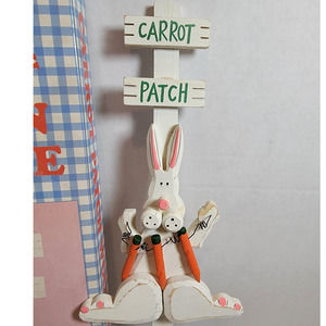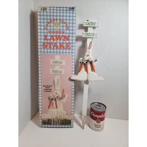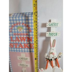 Vintage GiftCo Inc Carrot Patch Wooden Yard Stake with box Bunny rabbit Easter spring. Pics with tape measure and soup can for size visual. Nice preowned condition. 90s Nonsmoking home with awesome pugs.