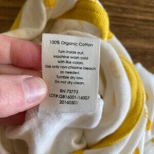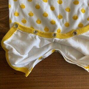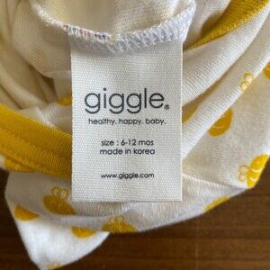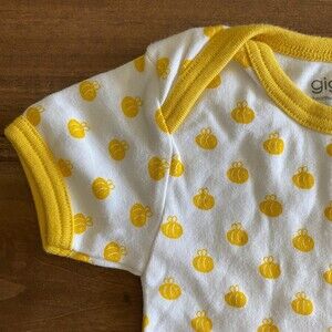 Giggle romper, infant 6-12 months, 100% organic cotton. Short envelope sleeves, short-length, full leg snaps, white with yellow bee print and yellow trim, Korean brand. Light wash wear, no stains.