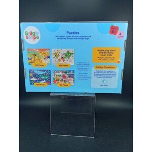 This Giggle Scape puzzle set includes four themed jigsaw puzzles offering progressive difficulty with 100, 150, and 200-piece counts. The themes—Safari, Under the Sea, Museum, and World Map—engage various interests while fostering fine motor skills and problem-solving abilities. Each puzzle features color-coded backs for easy sorting, aiding in organization and making cleanup simple with four included storage bags. The high-quality puzzle materials ensure durability for repeated use. Recommended for ages 6 and older. Dimensions: 14¼" x 10½" per puzzle.