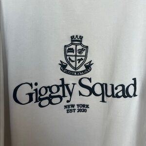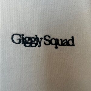 Black embroidery on the front reading “Giggly Squad” with large, black embroidered crest on the back