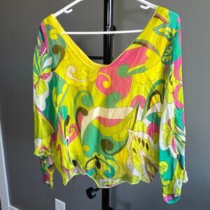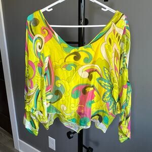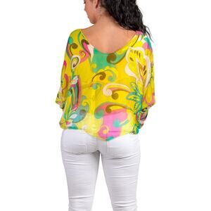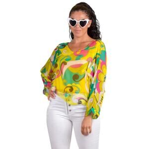 Dolman Sleeve Silk Crop Top with Groovy Abstract Print. Features a Stretch Interior Lining.