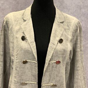 This Military Style Jacket has Rhinestones Stripes and Metallic decorating the collar, cuffs, front and hem.