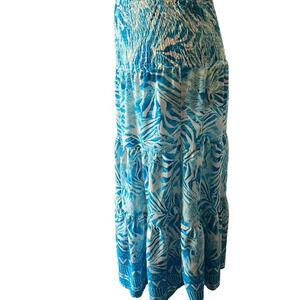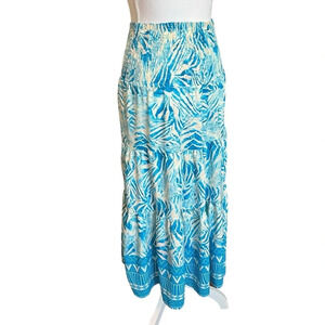 Long Three Tiered Skirt with a Ruched Elastic Waistband for a Custom Fit. Features a Tribal and Palm Leaf Print and smocked/elastic waist