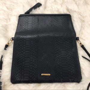 This beautiful, handcrafted, slim and roomy convertible clutch is made of embossed python leather and includes a zip closure. Includes a 23” drop strap. you will be able to sport it in 3 ways: as a clutch, a crossbody bag or a shoulder bag. Size: 7.5” W x 11" H (closed) & 13” W x 11” H folded out. Dark Navy Blue. 💙🖤. Excellent condition -maybe used once or twice but no signs of aware.
