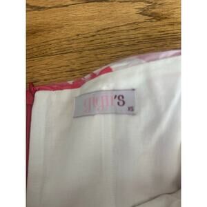 It features a ruched, gathered front with multiple cut-outs, puff sleeves that can be worn on or off the shoulders, and a gathered flare skirt. The dress is mini length with a zipper back and has a pink floral watercolor-style print. It is made of cotton and is available in size x-small. The dress originally priced at $625.