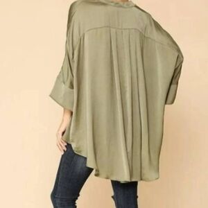 Size XL. Light sage green. Satin look and feel. Oversized. High front, low back. Button down. Pit to pit 36". Length in front 29". Length in back 33". Arm length from pit 5.5 ". Has 3.5". slit each arm.