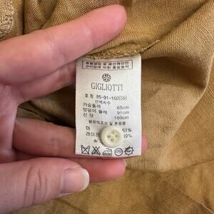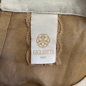 ~51% Linen / 49% Rayon | Measurements taken flat (approximate): Bust: 16”, Length (shoulder → hem): 34” | Condition: Excellent pre-owned; light wrinkling from linen fabric, no stains or flaws. | Made in: Italy (assembled in El Salvador per label, authentic Gigliotti brand tag) | Care: Dry clean or gentle hand wash recommended