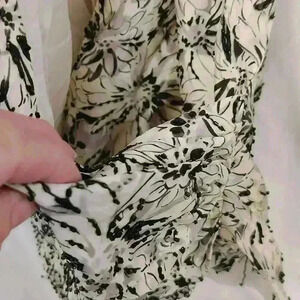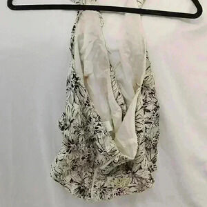 Aline neckline looks like it has a collar but it's only around the neckline zippers up and back has spaghetti straps so you can hang it on a hanger it has black accents The colorization of the shirt is dark creme as a background.. It's like flowers in the background that are silver or gray and black plastic-like accents can be formal or not would look great with some black pants or a black skirt.