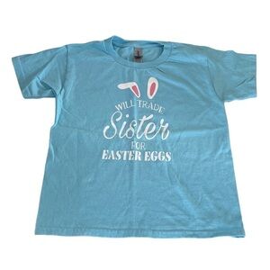Pre-owned Gildan 100% Heavy Cotton Blue Easter Graphic T-Shirt. Youth size XS. Blue color. T-shirt says “Will Trade Sister For Easter Eggs” Some markings on front side, otherwise, in good condition. See all photos.