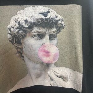 Black hoodie featuring a statue print with pink bubblegum detail. Statue Bubblegum Graphic Hoodie – Gildan Heavy Blend Black hoodie with bold graphic print of Michelangelo’s David blowing pink bubblegum. Soft fleece-lined interior with front kangaroo pocket & drawstring hood. Perfect for streetwear, Y2K, and art-inspired fashion lovers. Size: Large (tagged Gildan Heavy Blend) Color: Black Brand: Gildan Condition: Good pre-loved condition. Some light wear, graphic still vibrant (see photos). #streetwear #graphichoodie #y2kstyle #gildan #artcore