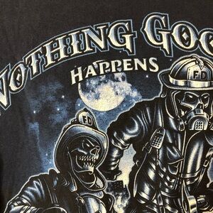 Gildan Coral Gables Nothing good happens after midnight Firefighters Blue Youth Medium. 100% cotton. Preowned, some wash wear/ cracking