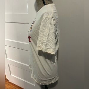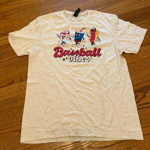 Cream short sleeve tee with fun baseball graphics. Love the vintage feel of the cream shirt and retro face icons. Good condition, no rips or pilling, but does have some subtle speckles on the back as pictured. Not sure if it’s just dirt and will wash away, or stains. Didn’t notice when I picked it up, but noticed it in a different lighting and definitely wanted to disclose. Priced accordingly.