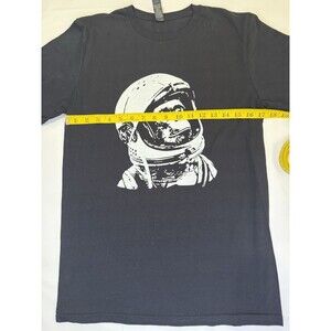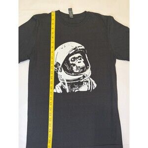 This Gildan Softstyle short sleeve t-shirt features a bold white graphic of a monkey in an astronaut helmet on a black background. Made of 100% cotton for a soft and comfortable feel. Unisex sizing tagged as Small (S/P/CH).