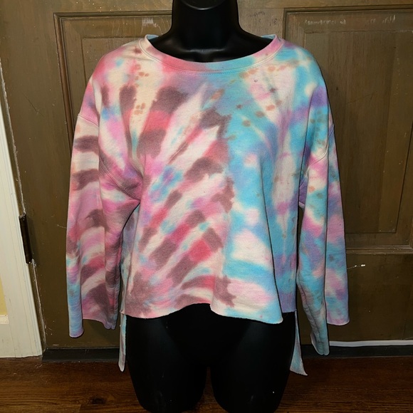New without tags custom tie dyed and cropped/ cut does have some small distressing as seen in pics, mainly just around the neck