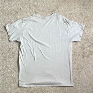 This Gildan white short sleeve tee features a delightful hand-drawn graphic on the front, adding a personal touch to its classic crew neck design. Crafted from soft, breathable fabric, it offers comfort and style for everyday wear.