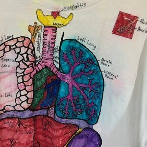 Short sleeve tee by Gildan. Features a vibrant anatomy graphic labeled and colored in organs for science project. Very eclectic. Would make a fun costume or party wear. Preowned.