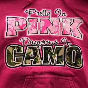 Stylish Gildan women's hoodie in size small featuring the bold "Pretty in Pink Dangerous in Camo" graphic design. Durable, soft blend material with kangaroo pocket and drawstring hood. Vibrant pink color ensures comfort and statement styling for casual wear.