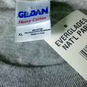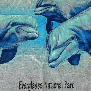Gildan XL dolphin tee WITH TAGS. 90% cotton; 10% polyester preshrunk. Made in Haiti; imported into Mexico. Everglades Nat’l Park, by Sunshine Apparel. Machine wash warm inside out; tumble dry medium. Approximate measurements: back of neck to hem, 28.75"; arm pit to arm pit, laid flat, 23.5".