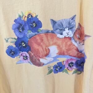 Gildan Yellow Cat Graphic Floral Tee Shirt Short Sleeve Cotton Crewneck Size XL