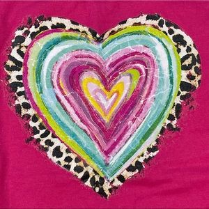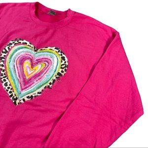 Gildan size large hot pink women’s sweatshirt with animal print & rainbow painted look heart in front. Heavy blend. See photos I took (ones that aren’t being modeled) for true color. It’s a darker bright pink.