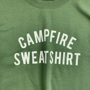 Green sweatshirt with the message "Campfire Sweatshirt" Inside is a fleece fabric. Very light pilling in on the outside of the fabric (which could be just how the fabric is made).