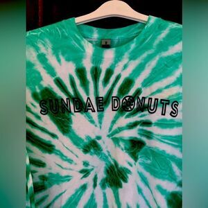 Gildan tie dye long sleeved midweight Heavy cottonT-shirt with the SUNDAE Donuts logo on front and additional designs on the sleeves. Very soft NWOT L. Vibrant colors.