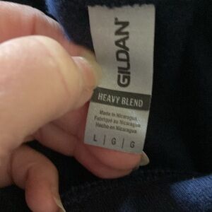 Gildan womens Lg navy hooded sweatshirt “Fueled by books & coffee “ screen print