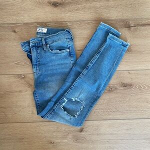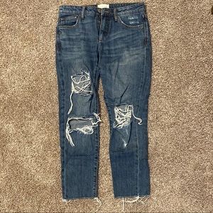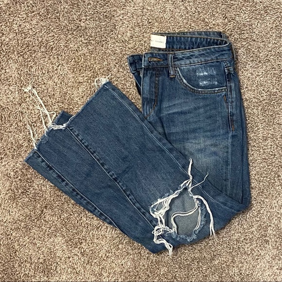 Distressed denim with a straight fit through the legs and a raw hem. Hits right at the ankle.