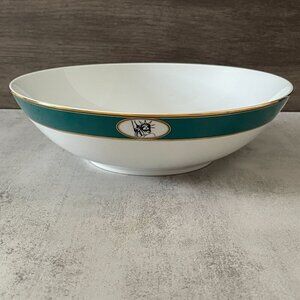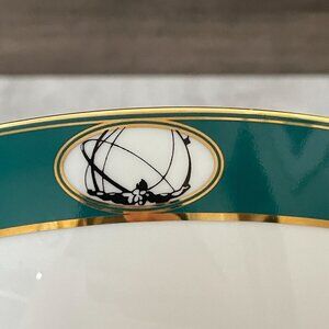 White porcelain bowl with black and white images of five New York City landmarks in circles along upper outside rim. Images contrast with teal background and band is trimmed in gold. Use as serving bowl or decor. By Giles of London for Fink & Carney. Made in Japan, dated 1999.