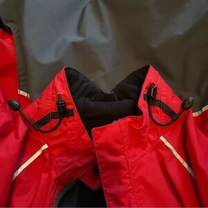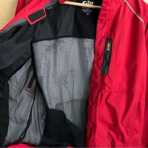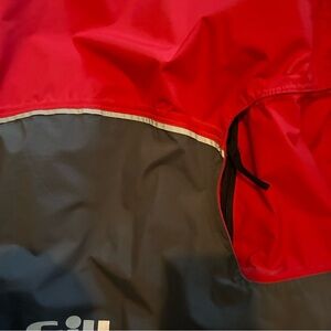 Good condition. Men’s Gill sailing jacket. Features full zipper closure with Velcro closure, cuffs have Velcro closure. Features 2 side zipper pockets and a chest zipper pocket and back zipper pocket. Sleeves have zippers. Jacket has a fleece lined collar and reflective features throughout. Please note: small tear on inside as shown in last photo.