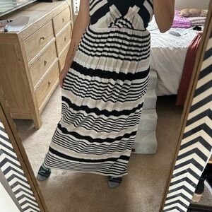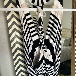 Stylish black and white striped maxi dress. Super cute backing. Sleeveless design with front that can be twisted for a different look. Perfect for casual outings. I’m 5’5 135 34DD. Not sure of the sizing but lots of room to give.