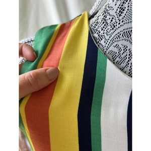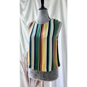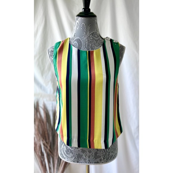 Gilli Bold Striped Sleeveless Blouse. Features multicolored vertical striped, a high neckline and button detail on left strap. Slightly cropped. Fully lined. A fun vintage feel.