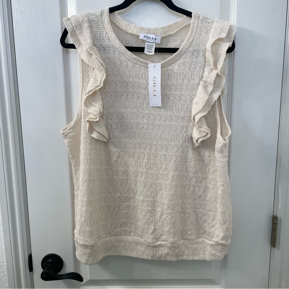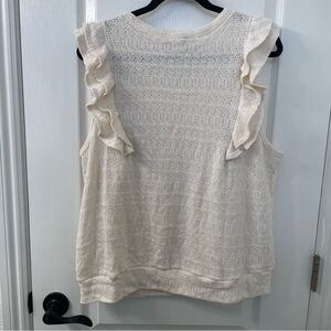 Elegant tank top with ruffle accents. Soft knit texture. Ideal for layering.
