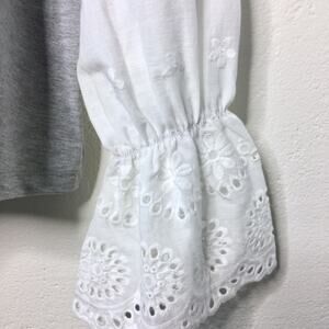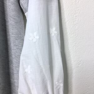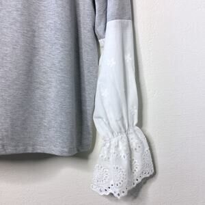 Want to feel casual but look dressed up and stylish? Look no further! This top features a light sweatshirt material body with embroidered half sleeves. Tee shirt material stops at about the elbow, and the rest of the sleeve is a thinner cotton with embroidered flowers, before finishing at a poet cuff with eyelet embroidery.