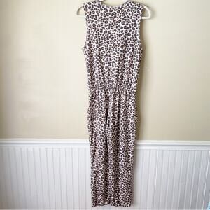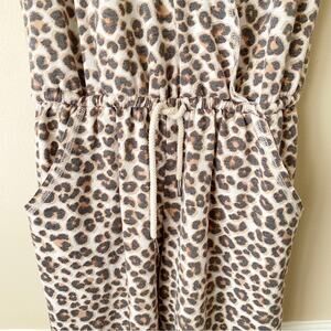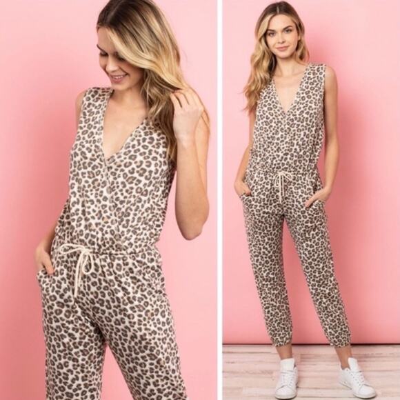 Features: Adorable jumpsuit, sleeveless, leopard animal print, surplice v-neck with closure, elastic waist with drawstring, pockets, elastic ankle hem, very soft and comfy, stretchy
