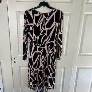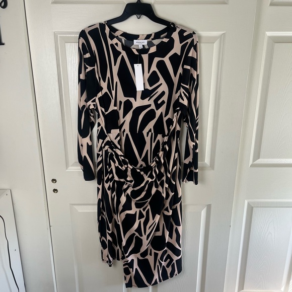 Step out in style with this elegant long sleeve dress featuring a striking black and tan pattern. Perfect for any occasion, this dress combines comfort with a bold design.