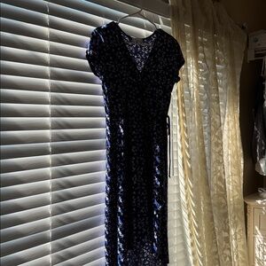 Chic navy maxi dress with floral design. Wrap style for a flattering fit. Ideal for casual outings.