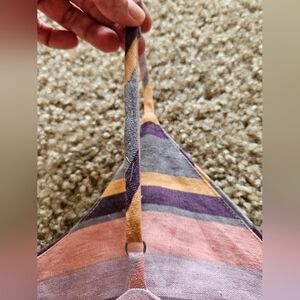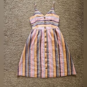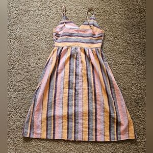 Chic v-neck A-line midi dress with pastel vertical stripes of pink, gray, purple, lilac, and orange. SIze Small.
