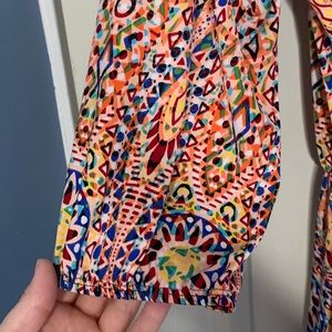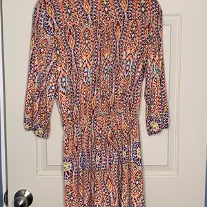 Like new, brightly colored long-sleeved romper. No signs of wear and tear. Silky feeling material that will move with you. I could not find a size label but my details are below to give you an idea of sizing. I’m going to list it as a medium, as that feels most appropriate.