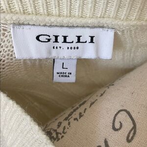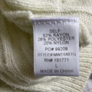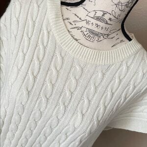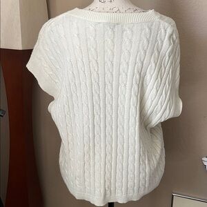 Sz large. Really nice cream colored lightweight cable knit short sleeve sweater. Great minimalist piece. Boxy fit. 21 inches pit to pit in 23 inches in the length. Nice boutique find.