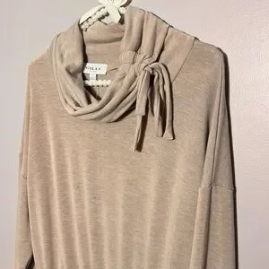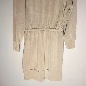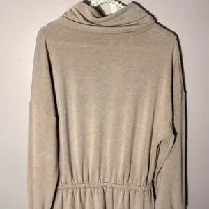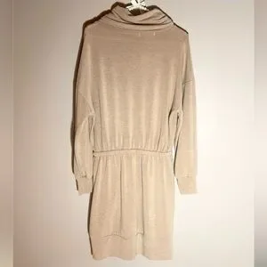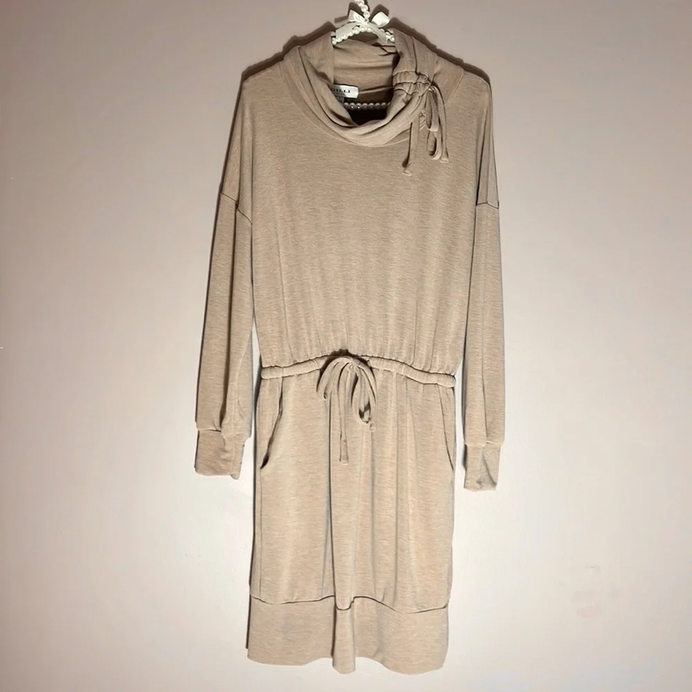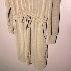 Gilli sweatshirt dress with pretty ruched/drawstring tie cowl neck, stretch elastic waist with drawstring, and side slant pockets - new with tags - pit to pit is 21” - length from highest shoulder is approx 34” - across flat (stretch) waist is 13.5” - the banded bottom is not fitted and hangs straight down - I would say this would fit best on a size 6 in dresses - would probably also work for size 8, but elastic waistband may be a little firm (not sure) - lightweight stretch, soft sweatshirt material - super cute!
