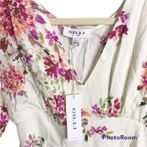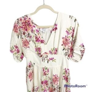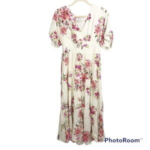 Brand new Gilli floral print midi dress. White dress with allover pink floral print. Short sleeves. Large fitted waistband. Tiered style bottom hem.