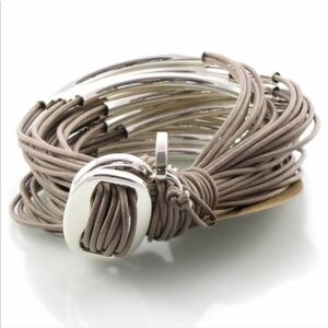 This bracelet is made up of 20 cords that each have a silver feature. Simple push-through clasp makes for an easy, secure closure. Silver plating and waxed cotton cord.