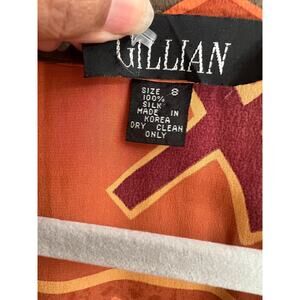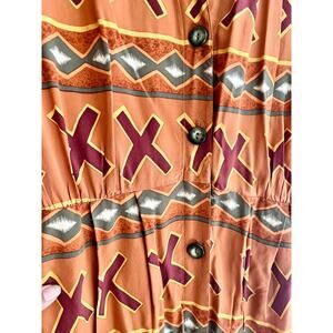 A true vintage gem: this stunning Gillian 100% silk midi dress features a bold tribal-inspired geometric print in warm sunset tones—orange, deep plum, and olive green. This button-down style has an elastic waist for a flattering fit, shoulder pads for structure (removable if desired), and a soft, fluid drape from the luxe silk fabric.
