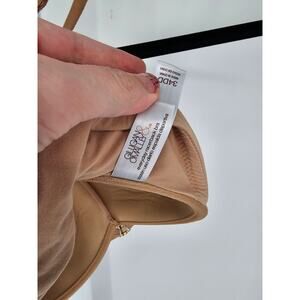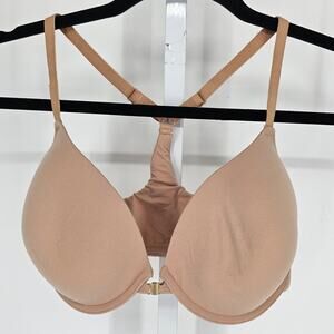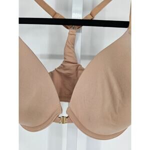 This bra is a size 34DD and features a convenient front clasp closure. The racerback design provides extra support and prevents straps from slipping. The solid beige color is perfect for everyday wear and will be invisible under most clothing.