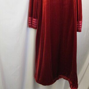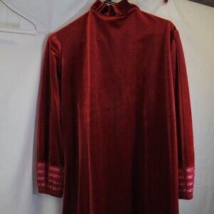 Gilligan & O'Malley red velvet robe with lace and satin trim at neck and on long sleeves. High ruffled neck and half-zip front. Great condition.
