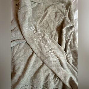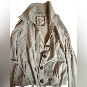 Cozy cardigan with button front. Embroidered sleeve design. Perfect for layering.